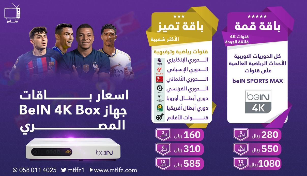 تجربة القمّة من beIN لعشّاق المحتوى المتميّز والحصري مع قناة 4K فائقة الجودة! احصل على كل المحتوى الرياضي الذي يمكن أن تتخيله، كبطولة أمم أوروبا وكوبا أمريكا وكأس العالم، وغيرها، واضف الترفيه الذي تحتاجه مع أفراد عائلتك لمشاهدة ما تختاره عند الطلب ومتابعة الأحداث الرياضية المباشرة أينما كنت